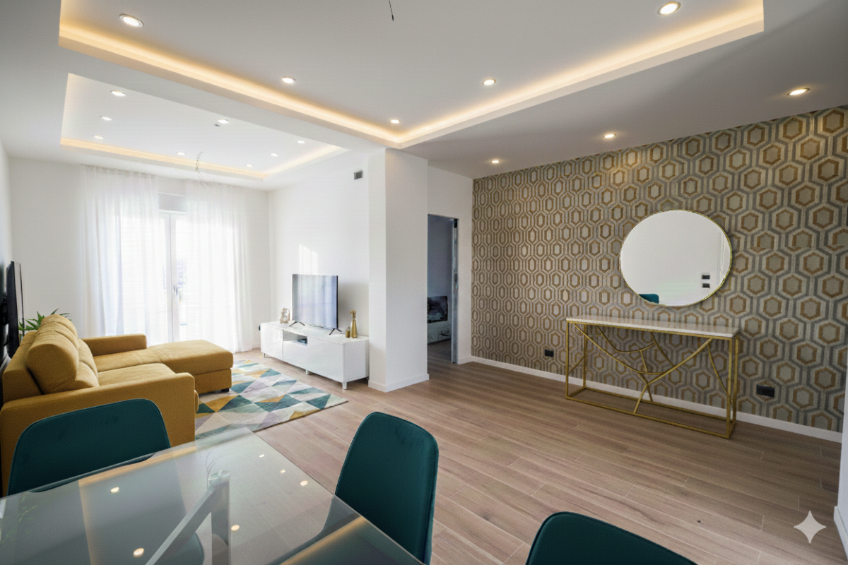 L’appartamento in questione sarà così composto: soggiorno, cucina/pranzo, disimpegno, camera da letto matrimoniale, n. 2 camerette, bagno padronale, bagno di servizio/lavanderia, ripostiglio, spazio esterno (balcone di circa 15 mq).